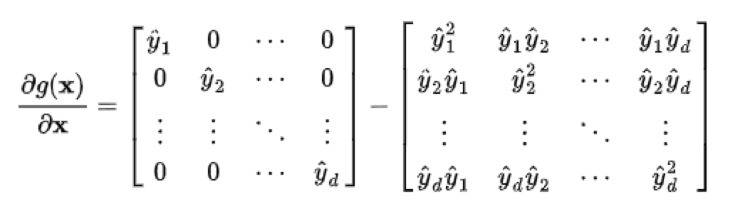 不妨简记softmax函数为g(⋅),softmax得到的分布向量y^=g(X)。对于输入X的梯度为: