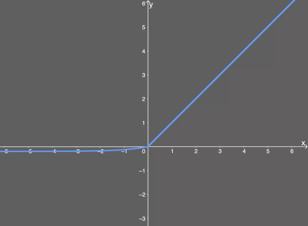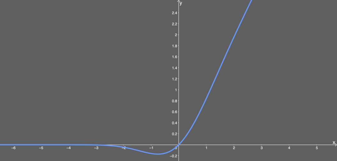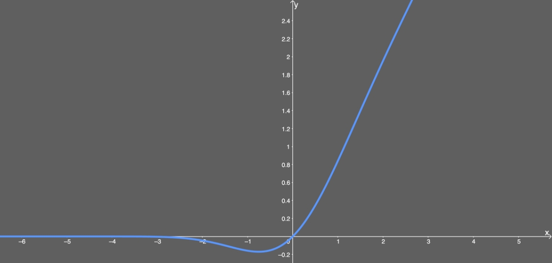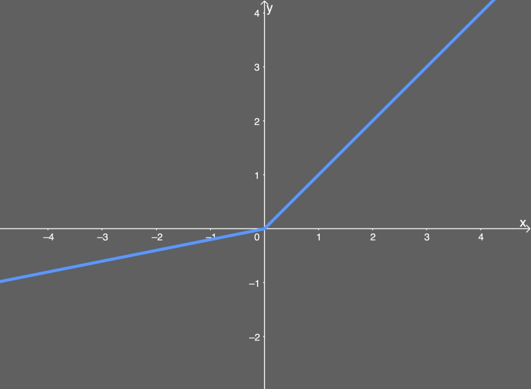 也就是说:如果输入的 x 值大于 0,则结果与 ReLU 一样——即 y 值等于 x 值;但如果输入的 x 值小于 0,则我们会得到一个稍微小于 0 的值。