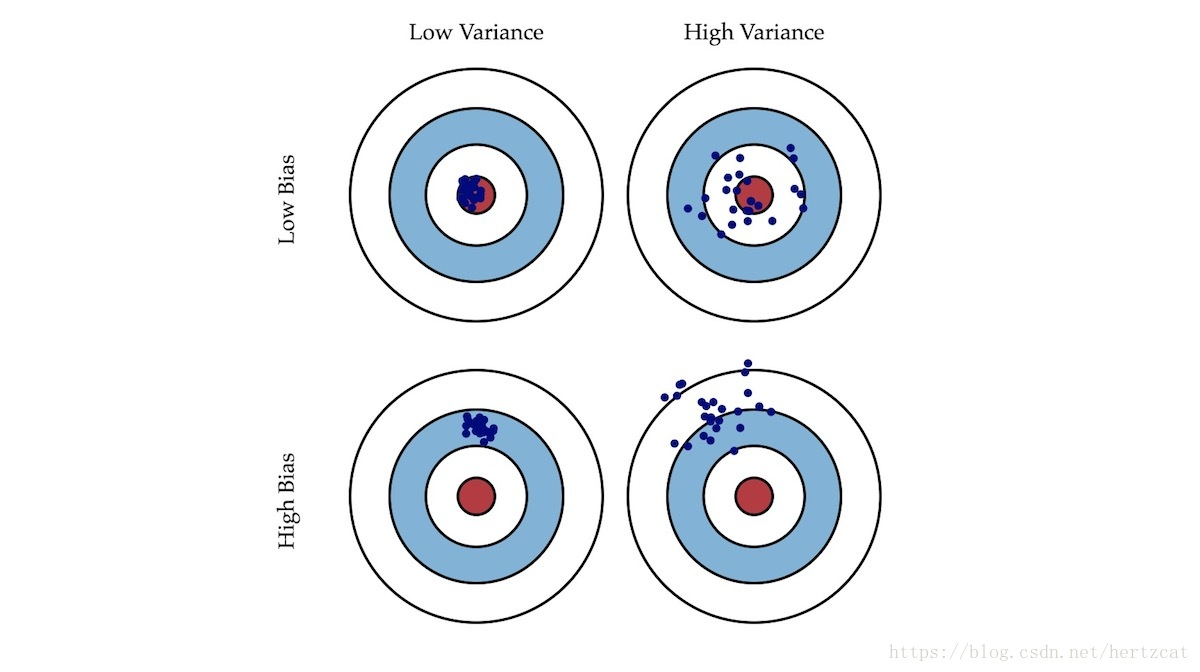 就像打靶一样,偏差描述了我们的射击总体是否偏离了我们的目标,而方差描述了射击准不准。如下图: