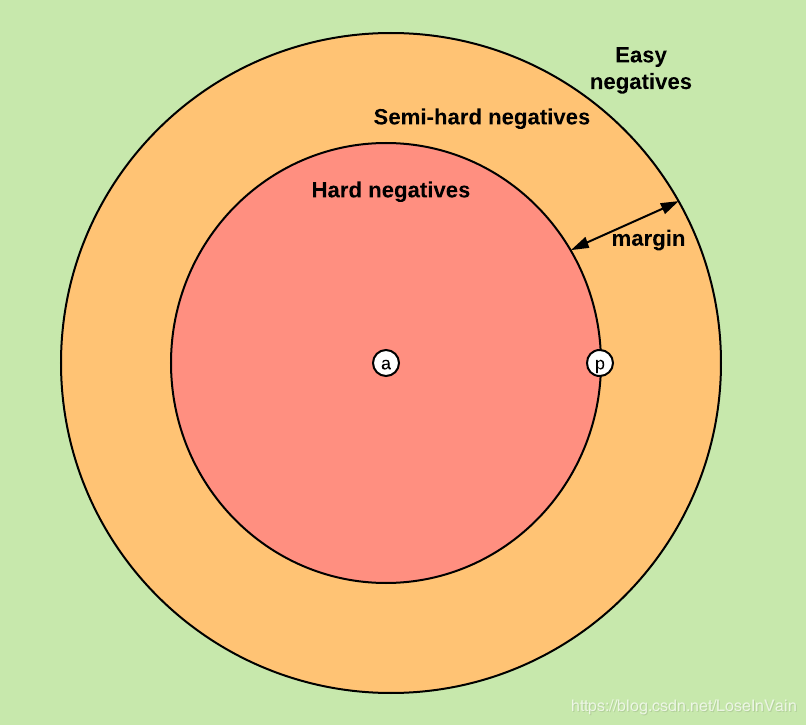 semi-hard triplet:d(ra,rp)<d(ra,rn)<d(ra,rp)+m。负样本到锚点样本的距离比起正样本来说,虽然是大于后者,但是并没有大于设定的阈值m,此时loss仍然为正值,但是小于m,此时网络可以继续更新。