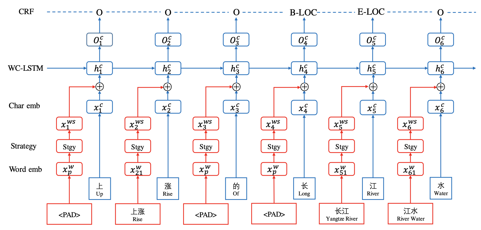 主要的核心思想:它是Lattice-LSTM模型的改进版,WC-LSTM解决了Lattice-LSTM不支持batch的问题;正向和反向的LSTM分别挂载不同的词信息。
