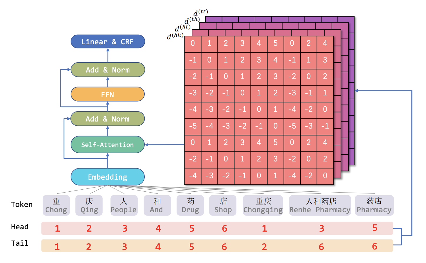 每个token都有head和tail这样2个位置信息,所以,作者设计:每2个token间,由4种相对距离表示xi和xj之间的关系:head-head,head-tail,tail-head,head-tail这样的相对位置信息,如下图: