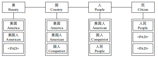 对于下图中的输入文本【美国人民】,字符【美】匹配到的词语为【美国、美国人】,字符【国】匹配到的词语为【美国、美国人、国人】,以此类推。其中,作者会提前构建一棵字典树(Trie树),用来匹配输入序列中的词语,然后得到每个字符对应的词语序列。